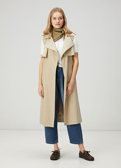Bej Teknik Kumaş Uzun Yelek