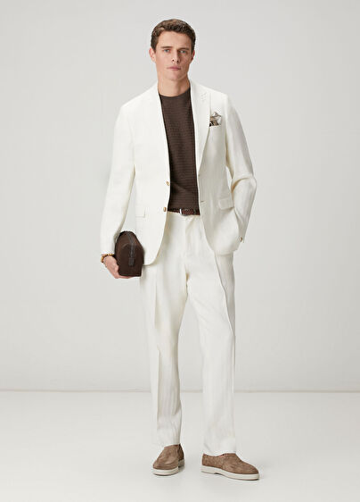Jacket: Peak lapel, button closured, double slit, 3 outer pockets, 2 inner pockets