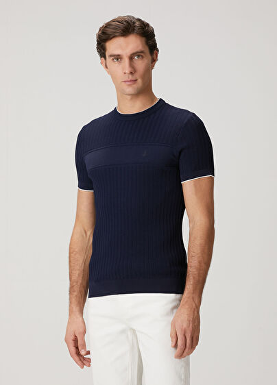 Lacivert Waffle Örgü Dokulu Kısa Kollu Kazak
