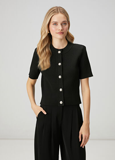 Bisiklet yaka, kısa kollu, triko ceket Simli dokulu, gold düğmeli Ürün bedeni: S / Model ölçüsü: Boy: 174 cm - Göğüs: 83 cm - Bel: 59 cm - Kalça: 88 cm Yeni sezon hazır giyim alışverişlerinizde ücretsiz tadilat yapılmaktadır100% Polyester2026 - Spring/SummerProduct Code: 102338406_999