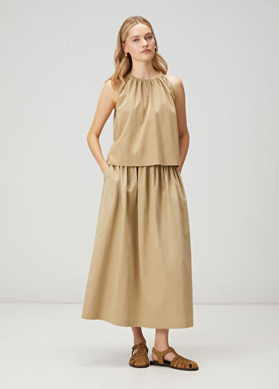 Beli lastikli, flat kumaş, midi etek