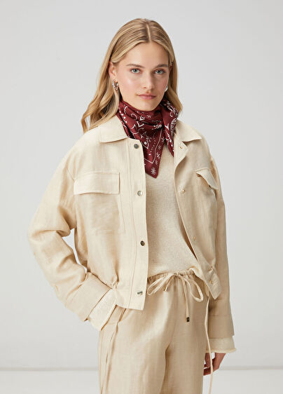 Çıtçıt kapatmalı, parlak keten bomber ceket