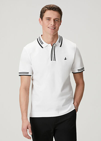 Polo yaka, düğme kapatmalı t-shirt Patı ve kol ucu çizgi desenli Ürün bedeni: M / Model ölçüsü: Boy: 187 cm - Göğüs: 102 cm - Bel: 82 cm - Kalça: 92 cm Yeni sezon hazır giyim alışverişlerinizde ücretsiz tadilat yapılmaktadır