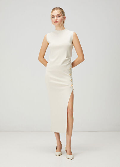 Beli lastikli, gold düğmeli, midi triko etek