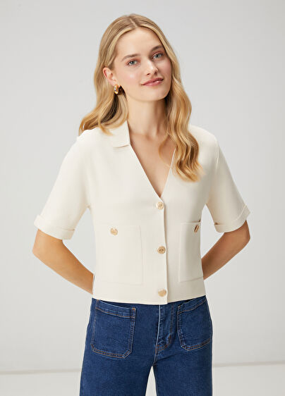 V yaka, gold düğmeli, kısa kollu triko ceket 2 adet cepli Ürün bedeni: S / Model ölçüsü: Boy: 174 cm - Göğüs: 83 cm - Bel: 59 cm - Kalça: 88 cm Yeni sezon hazır giyim alışverişlerinizde ücretsiz tadilat yapılmaktadır