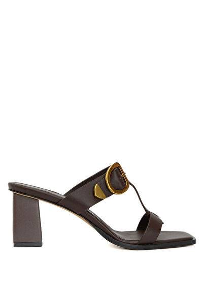 Kahverengi Amorf Tokalı Kadın Deri Topuklu Terlik
