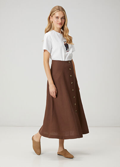 Yüksek bel, midi boy, kuplu kloş keten etek