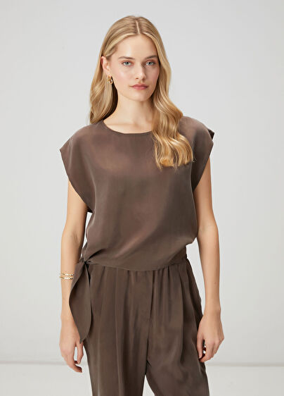 Bisiklet yaka, düğüm detaylı, düz renk bluz