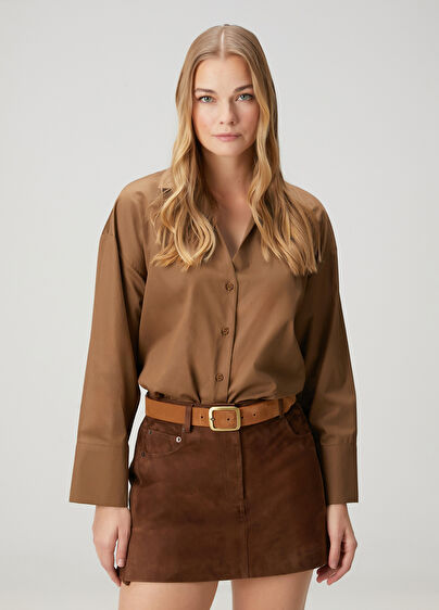 V yaka, düğme kapatmalı, logo nakışlı gömlek