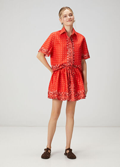 Beli bağcıklı, şal desenli, mini etek