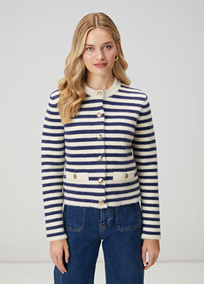 Bisiklet yaka, çıtçıt kapatmalı, çizgi desenli hırka Ürün bedeni: S / Model ölçüsü: Boy: 174 cm - Göğüs: 83 cm - Bel: 59 cm - Kalça: 88 cm Yeni sezon hazır giyim alışverişlerinizde ücretsiz tadilat yapılmaktadır