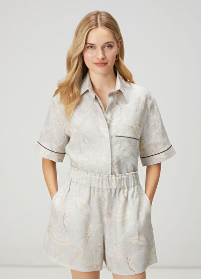 Klasik yaka, düğme kapatmalı, şal desenli, keten gömlek