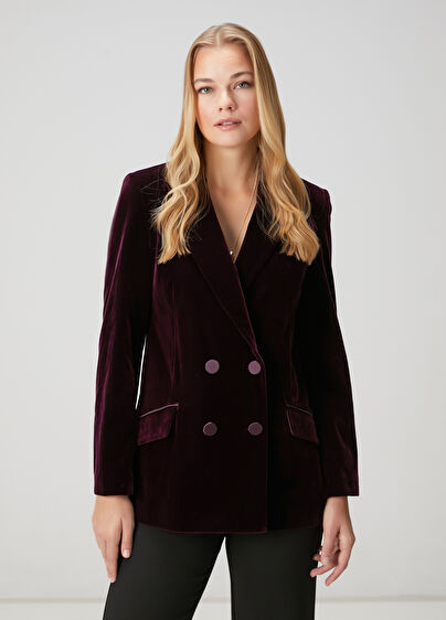 Kırlangıç yaka, çift sıra düğme kapatmalı, kadife kruvaze abiye ceket