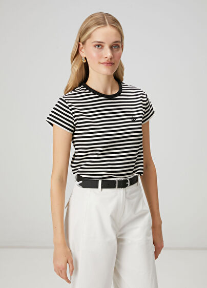 Bisiklet yaka, çizgi desenli, logo nakışlı, tok kumaş t-shirt