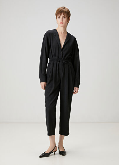 Bisiklet yaka, düğme kapatmalı, uzun kollu, çizgili tulum