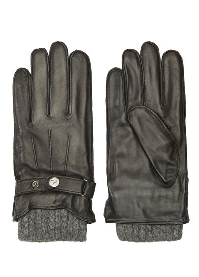 Çıtçıt detaylı, ribana detaylı, deri eldiven