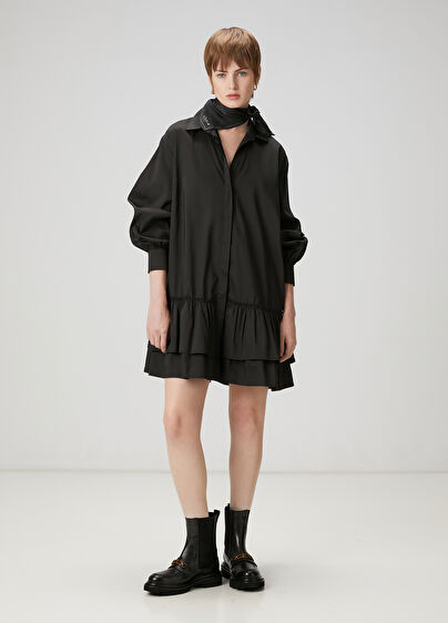 Gömlek yaka, düğme kapatmalı, eteği fırfır detaylı, mini elbise