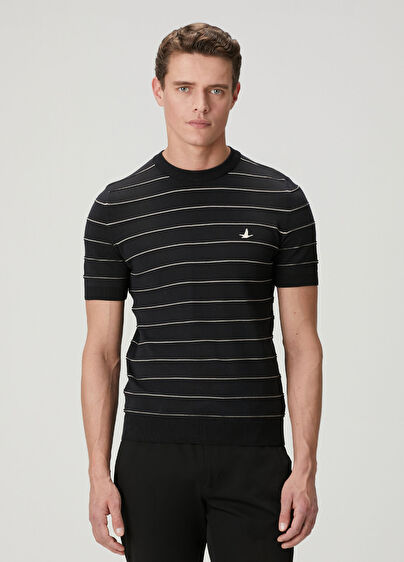 Bisiklet yaka, çizgi dokulu, logo nakışlı kazak Ürün bedeni: M / Model ölçüsü: Boy: 187 cm - Göğüs: 102 cm - Bel: 82 cm - Kalça: 92 cm Yeni sezon hazır giyim alışverişlerinizde ücretsiz tadilat yapılmaktadır