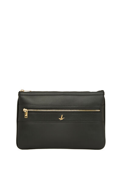 Fermuar kapatmalı, logo detaylı, düz renk el portföyü