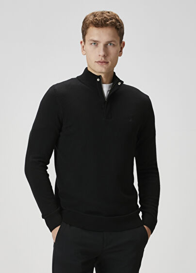 Yakası fermuar kapatmalı, patı süet detaylı, logo nakışlı, kaşmir karışımlı yün kazak