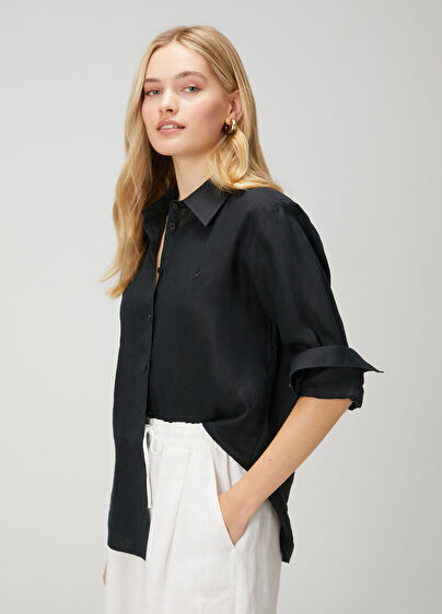 Klasik yaka, düğme kapatmalı, logo nakışlı, keten gömlek