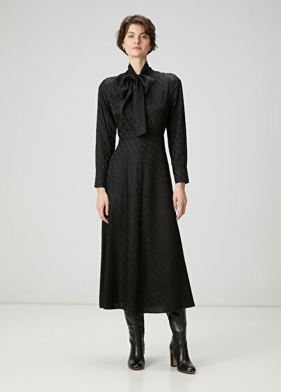 Yakası bağcıklı, logo jakarlı, midi boy, ipek elbise