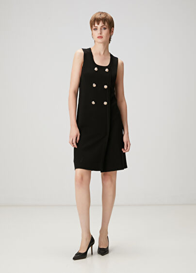 U yaka, gold düğmeli, kolsuz, mini yün triko elbise