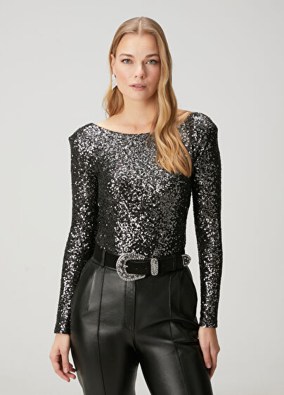 Kayık yaka, çıtçıtlı, payetli, drapeli abiye bluz