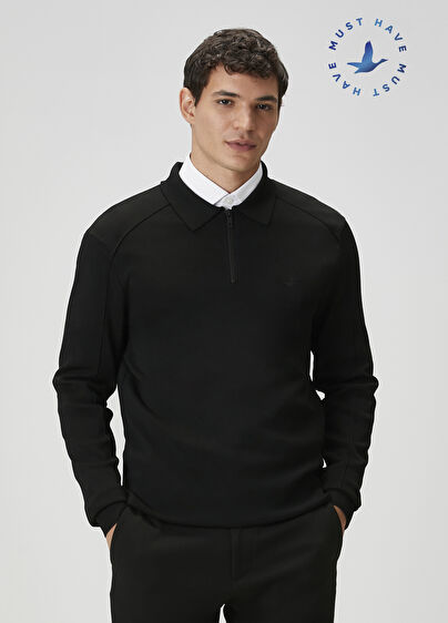 Polo yaka, fermuar kapatmalı, logo nakışlı, reglan kollu triko