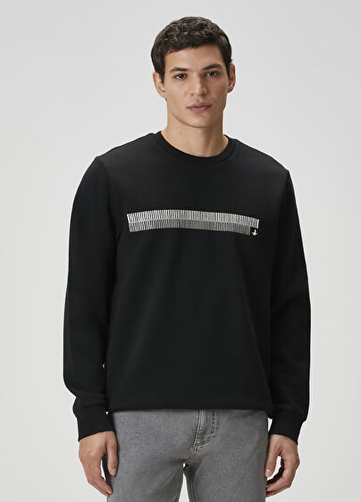 Bisiklet yaka, şeritli nakışlı, kaz detaylı sweatshirt