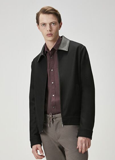 Yakası deri garnili, fermuar kapatmalı, yün ceket